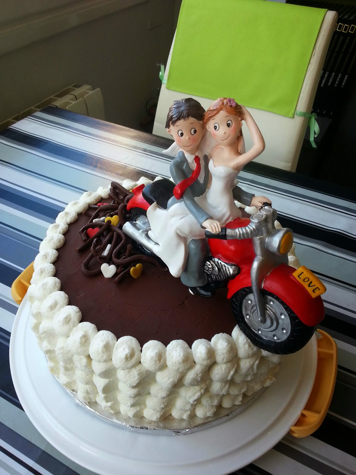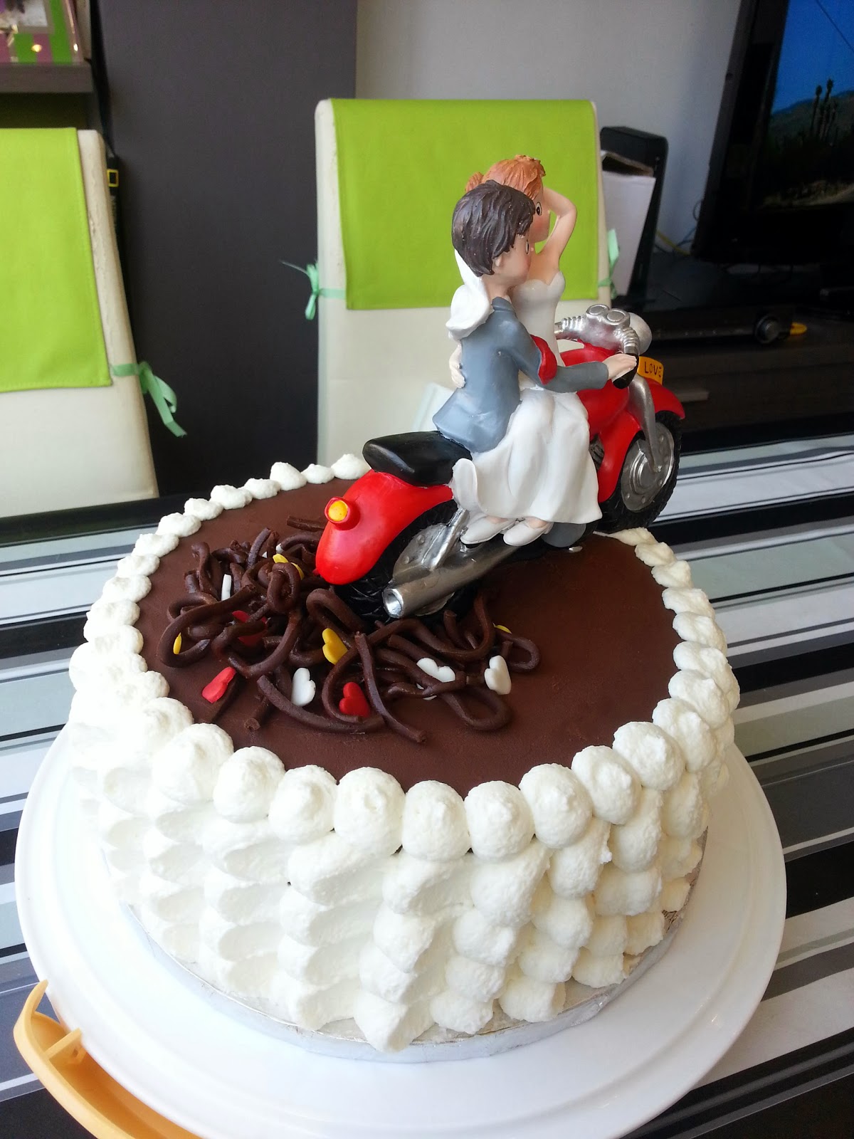 Puesto que los muñecos eran un pelin grandes respecto la tarta, y la estabilidad era pesima porque no tenia base, se me ocurrió la idea de hacer ver que la moto salía de la tarta, pudiendo clavar la rueda posterior en el ganache y dandole más estabilidad. Y el hecho de desplazarla, hacía que las figuras adquirieran movimiento.